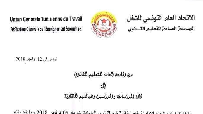 قررت الجامعة للتعليم الثانوي عبر منشور صادر عنها مقاطعة امتحانات الثلاثي الأول من السنة الدراسية الحالية، و تضمن المنشور تفاصيل عملية المقاطعة كالإمتناع عن تسليم مواضيع الامتحانات الخاصة بالأسبوع المغلق إلى الإدارة و مقاطعة كافة حصص المراقبة أثناء هذا الأسبوع مع مواصلة التدريس بصفة عادية وفقا لجداول الأوقات الرسمية
