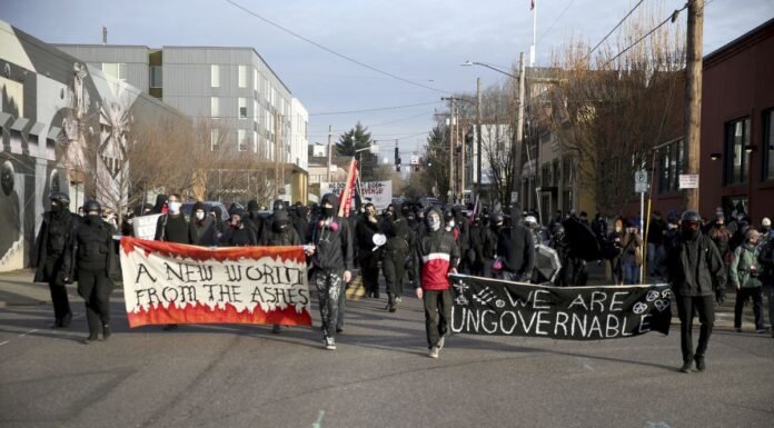 المتظاهرون المناهضون لبايدن في بورتلاند وأوريغون يلحقون الضرر بمقر الحزب الديمقراطي